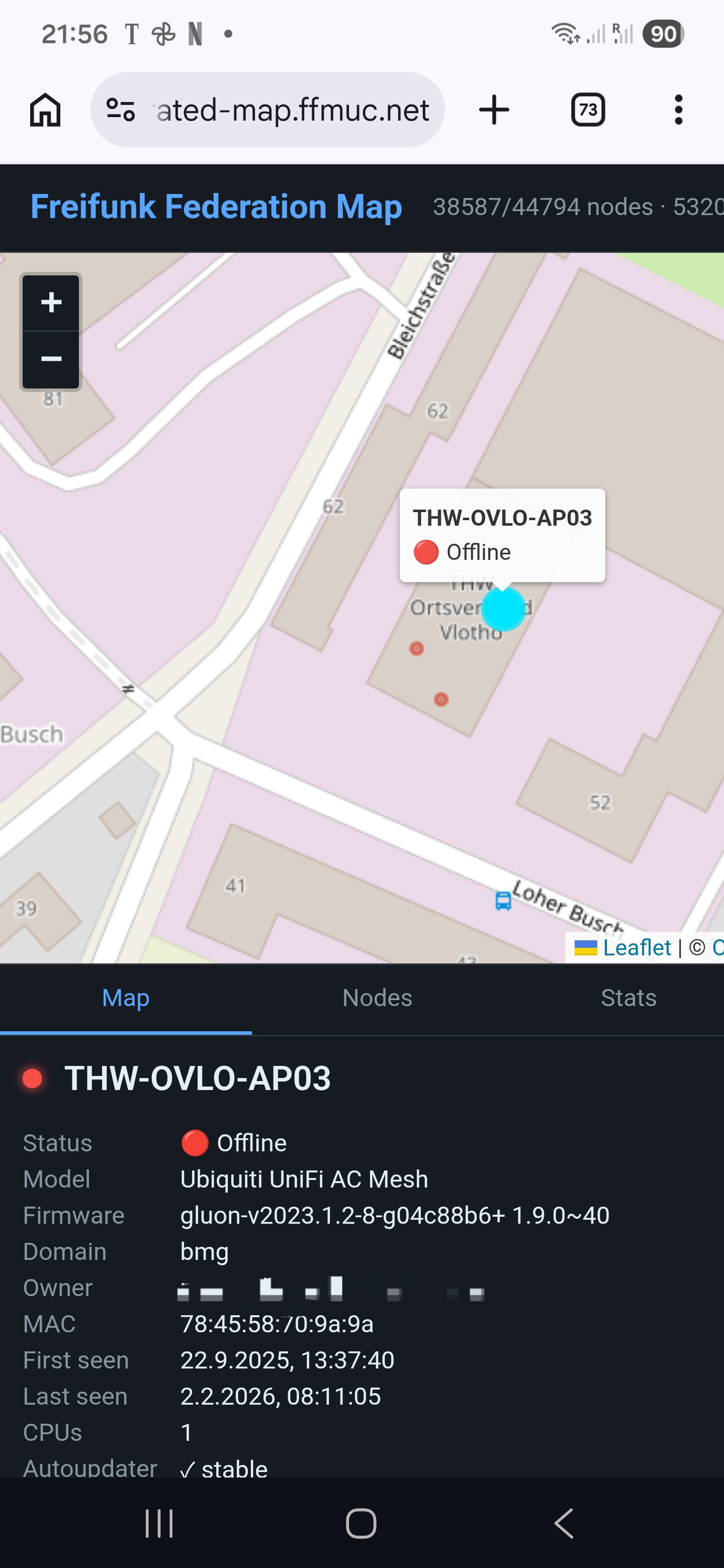 … sind nur noch legitime Abrufe zulässig. Wir zeigen die Kontaktdaten ausdrücklich nicht auf unseren Karten an und auch nicht auf den Statusseiten der Knoten (dort findet sich bei hinterlegten Daten nur eine Aliasadresse). Offensichtlich müssen wir diese Daten leider also doch schon auf den Knoten verschlüsseln — bis dahin gibt’s notgedrungen den Datenzugriff auf die Daten gem. API eben nur noch per Whitelist, schade.