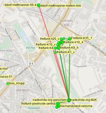 An dieser Stelle möchte ich mich bei @pixelistik und @trickster bedanken, die in den letzten Tagen im Niemandsland zwei Router neu belebt und einen dazugestellt haben, wo es Probleme mit der Stromversorung/Aufstellung geben hattte (Ökoma-Laden) und damit diese beim Domainumung verschollenen Geräte ins lokale Mesh zurück geholt haben.