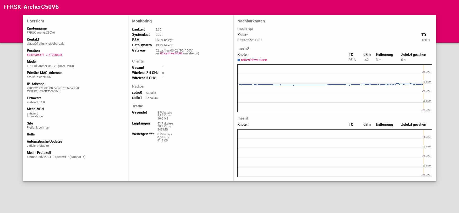 stable.3.14.1 liegt jetzt auf dem Update-Server zum Download, nachdem bei der vorigen Version einige targets nicht gebaut wurden. Dazu noch Paketabhängigkeit vom tunneldigger watchdog angepasst und Support für unifi-6-lr-v2 und unifi-6-lr-v3 hinzugefügt.